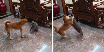 The dog is seen appearing at the entrance of the shop and grabbing the cat’s collar with its teeth, dragging the cat inside the shop.