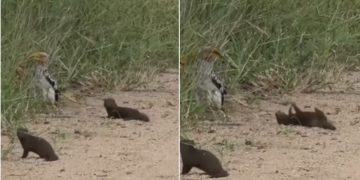 At first glance, there are no snakes to be seen in the river however, upon closer look, you may spot a snake camouflaged in it.