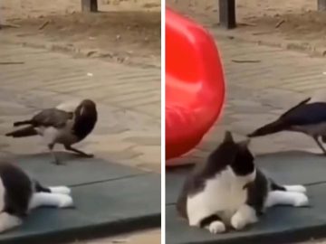 An unique and interesting cat-and-crow duo The video shows a cat lying on the ground while the crow is sitting behind it. Clearly in a...