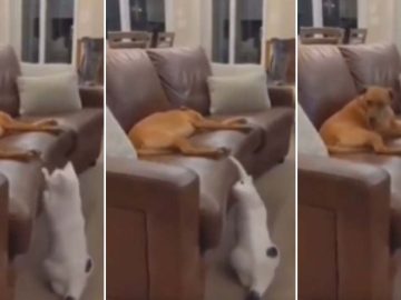 A video of a cat playing peekaboo with sleeping dog. In the video, a dog is seen sleeping peacefully on a couch when a cat...