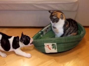 Puppy tries to reclaim his bed from the cat 10-week-old Pixel, a French Bulldog, tries to reclaim his bed from a cat who just doesn’t...