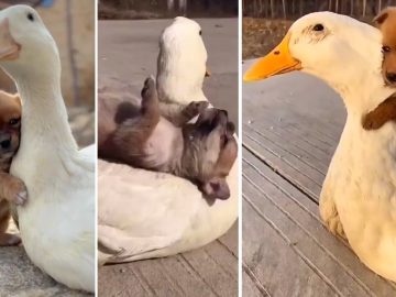 This might be the cutest thing you see today. Mama duck seems to be running a daycare for this puppy as he happily rides on...