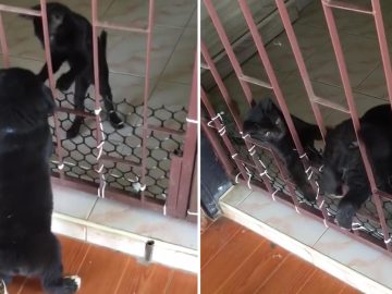 Cat Helps Struggling Puppy Get Through The Gate The dog becomes stuck when trying to wiggle its legs and tail through. The feline tries to...