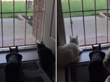 Dog Startles Three Cats Watching A Bird A trio of cats who were pensively contemplating on birds on the other side of the door were...