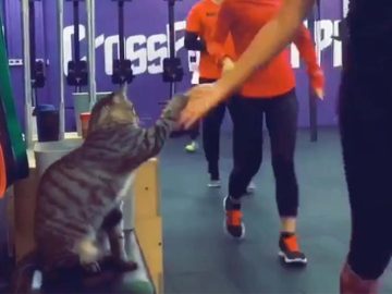 Cat high-fives people working out at the gym. A friendly cat gave CrossFitters encouraging high fives as they ran by him at a gym in...