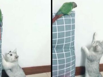 The cat acts sneaky and puts its paws on the couch to attack the parrot but the parrot catches the cat red-handed. The video shows...
