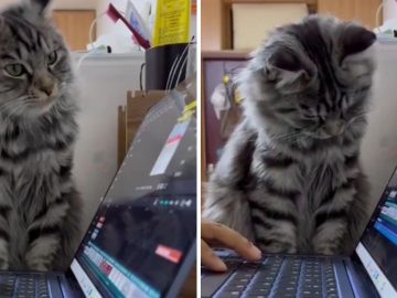 When you have to work under supervision A feline sits in front of a laptop and watches what’s happening on the screen like a work...