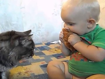 This video is just too damn cute. The baby snacking on some food, but as soon as he noticed the cat close to him, he...