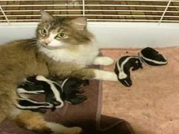 Just one week after coming into this world, six baby skunks were abandoned by their mother. Luckily for them, a farm cat who recently gave...