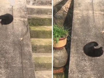 Cat entertains itself by sliding down a slope. Watching this black cat gliding swiftly down a concrete slope is bound to put a huge smile...