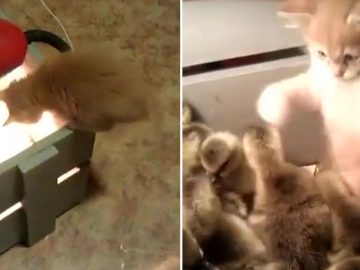 Kitten jumps in box full of ducklings When this curious kitten dives head first into the duckling box, it gets bombarded with cuteness. ...
