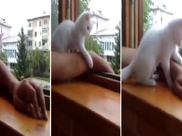 A baby cat wanted to eat anchovies on the table. She jumped on the chair and stretched out her little paws to catch the dried...