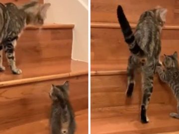 Mama cat teaching her kitten how to climb stairs. In the 29-second clip, a cat can be seen helping one of her little kittens up...
