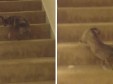 Dog Has A Peculiar Way Of Running Down The Stairs An excited little brindle dog gets his energy out by running in well timed circles...