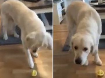 Watch this Golden Retriever react to the taste of a lemon for the first time.