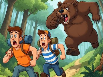 Two guys are out hiking. All of a sudden, a bear starts chasing them. They climb a tree, but the bear starts climbing up the...