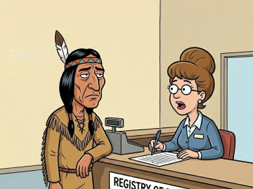 Indian warrior decided to change his name and went to the Registry of BDM (birth, death, marriages). He approaches the counter and talks to the...