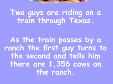 Two guys are riding on a train through Texas. As the train passes by a ranch the first guy turns to the second and tells...