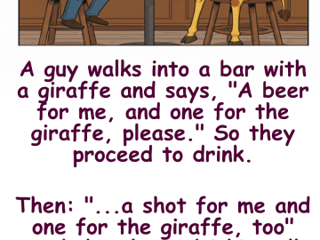 A guy walks into a bar with a giraffe and says, “A beer for me, and one for the giraffe, please.” So they proceed to...