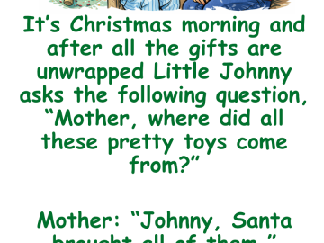 It’s Christmas morning and after all the gifts are unwrapped Little Johnny asks the following question, “Mother, where did all these pretty toys come from?”...