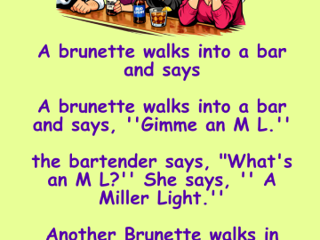 A brunette walks into a bar and says A brunette walks into a bar and says, ”Gimme an M L.” the bartender says, “What’s an...