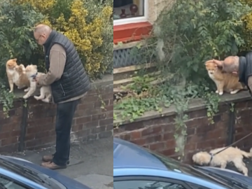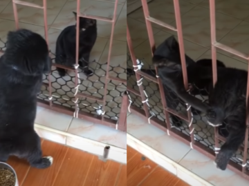 Adorable moment man introduces his puppy to neighborhood cat goes viral