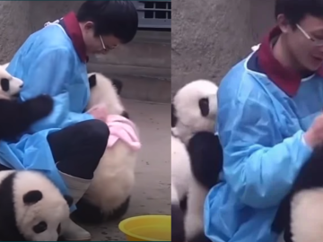 Cute alert! While helping one panda take a bath, a panda keeper has another cub climb on his back looking to cuddle. In the video,...