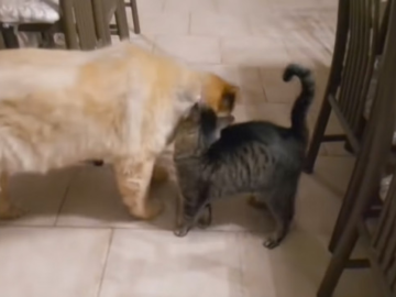 People often say that cats and dogs are mortal enemies, but sometimes they can be best friends forever. This is a Dog, its name is...