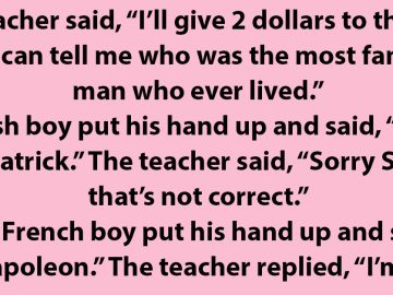 The teacher said, “I’ll give 2 dollars to the child who can tell me who was the most famous man who ever lived.” An Irish...
