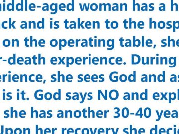 A middle-aged woman has a heart a.ttack and is taken to the hospital. While on the operating table, she has a near-d.eath experience. During that...
