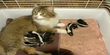 Barn Cat Nurses Six Newborn Skunks That Were Abandoned by Their Mom!
