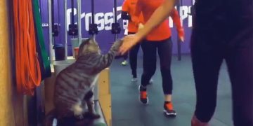 Cat gives out high fives to gymer as purr-fect motivation for their workouts.