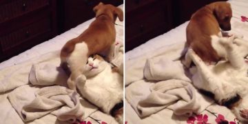 Adorable puppy sits on cats face. I can’t stop laughing!