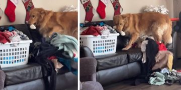 Golden Retriever Finds Laundry On Couch. He Knows Exactly What To Do.