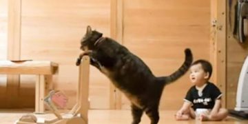 Smart cat teaches baby how to walk on two legs