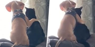 Adorable puppy cuddles up to kitten and watching birds together. The Sweetest Thing!