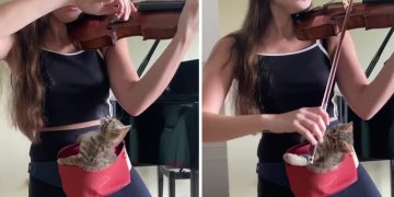 This girl finds cute way to hold her kitten while practising violin.