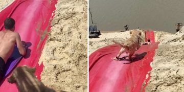 This puppy absolutely loves water sliding. He quickly jumped in too!