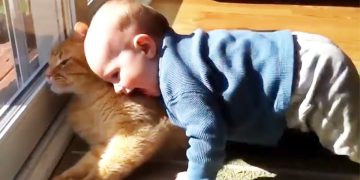 Baby just cannot stop hugging his cat and it is the cutest moment ever