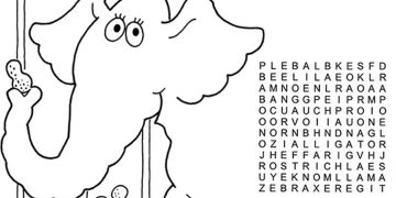 Zoo Animals Search-a-Words: Find Alligator, Camel, Flamingo, Zebra, and Tiger.