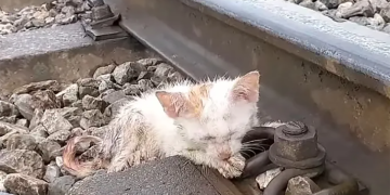 Lucky to find and save the exhausted cat in the rain on a dangerous train track