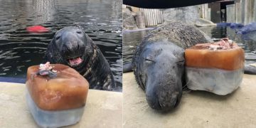 This cute seal named Yulelogs had a special birthday surprise—a cake made of ice and fish!