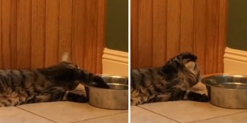 This cat raise the laziness bar when it refuses to stand when drinking water.