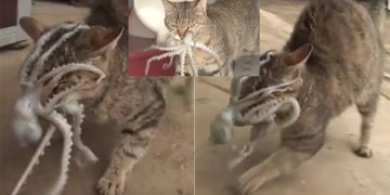 CatsCats stealing “Live Octopus” are counter-attacked by them with Its tentacles grasping the cats faces