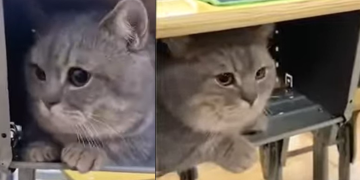 Lifecat, funny catAdorable Munchkin Cat Stays Quiet Inside The Desk While In Classroom With His Owner